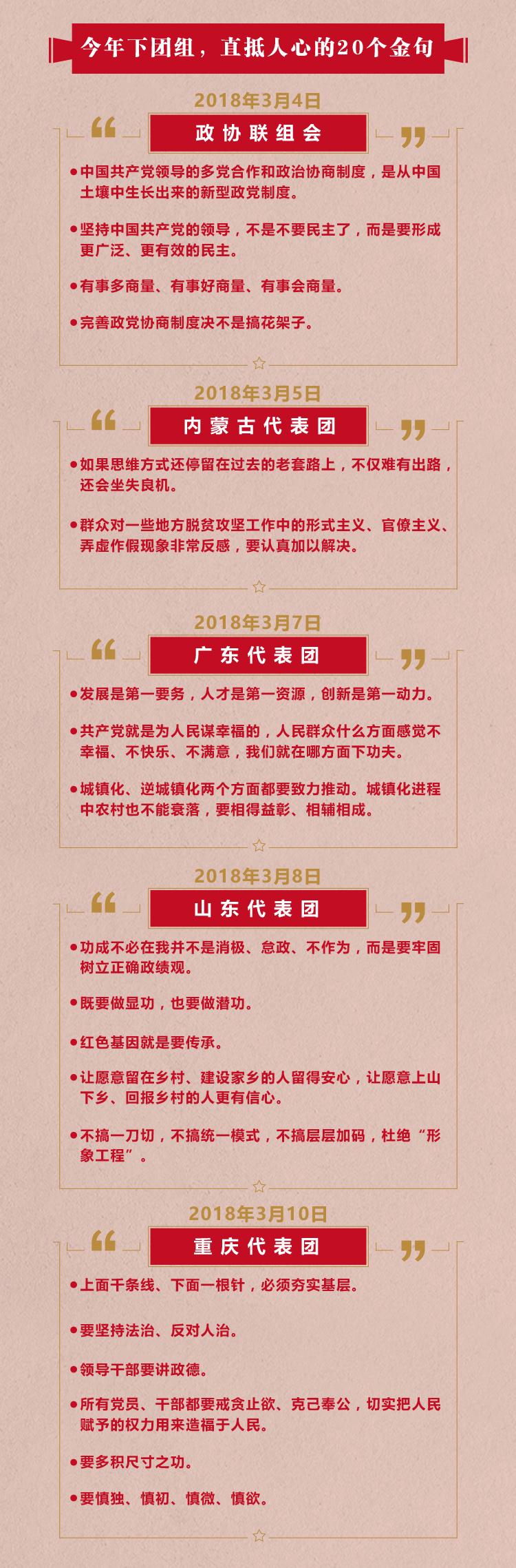 这些话,都出自习近平。习近平这10段掷地有声的话语,回荡在五个代表团全体会议的会场,也通过当晚央视《新闻联播》传播到了全国。